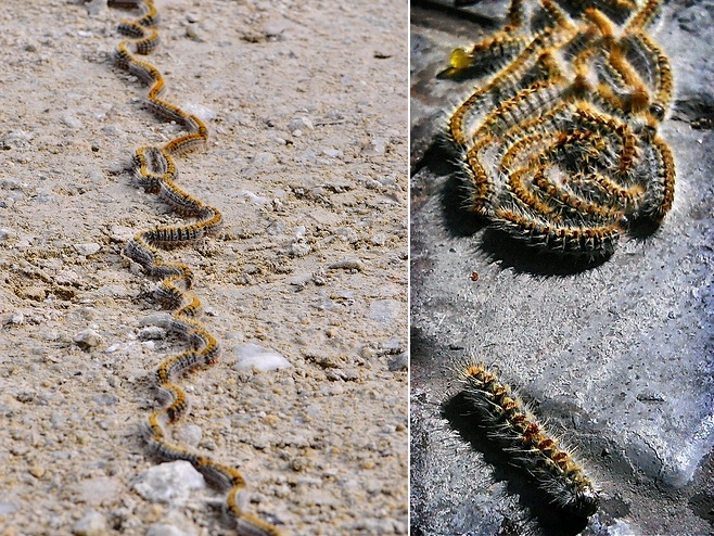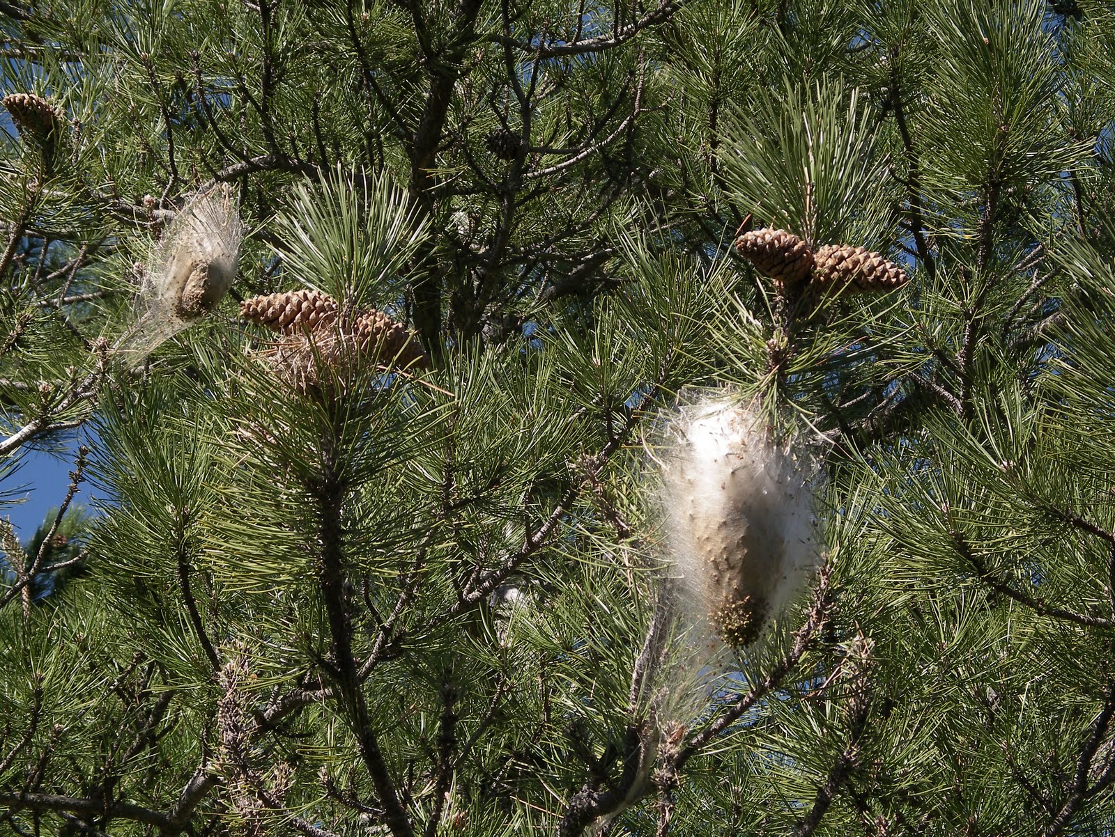 Las procesionarias (los gusanos de los pinos) se localizan en las copas de los pinos en una especie de bolas blanquecinas como podéis ver con la foto. En marzo descienden por los troncos en procesión (por eso reciben este nombre). En el momento que los animales entran en contacto con los pelos de las orugas, estas desprenden una toxina que produce: urticaria, alergias y necrosis (muerte del tejido) en las zonas de contacto.